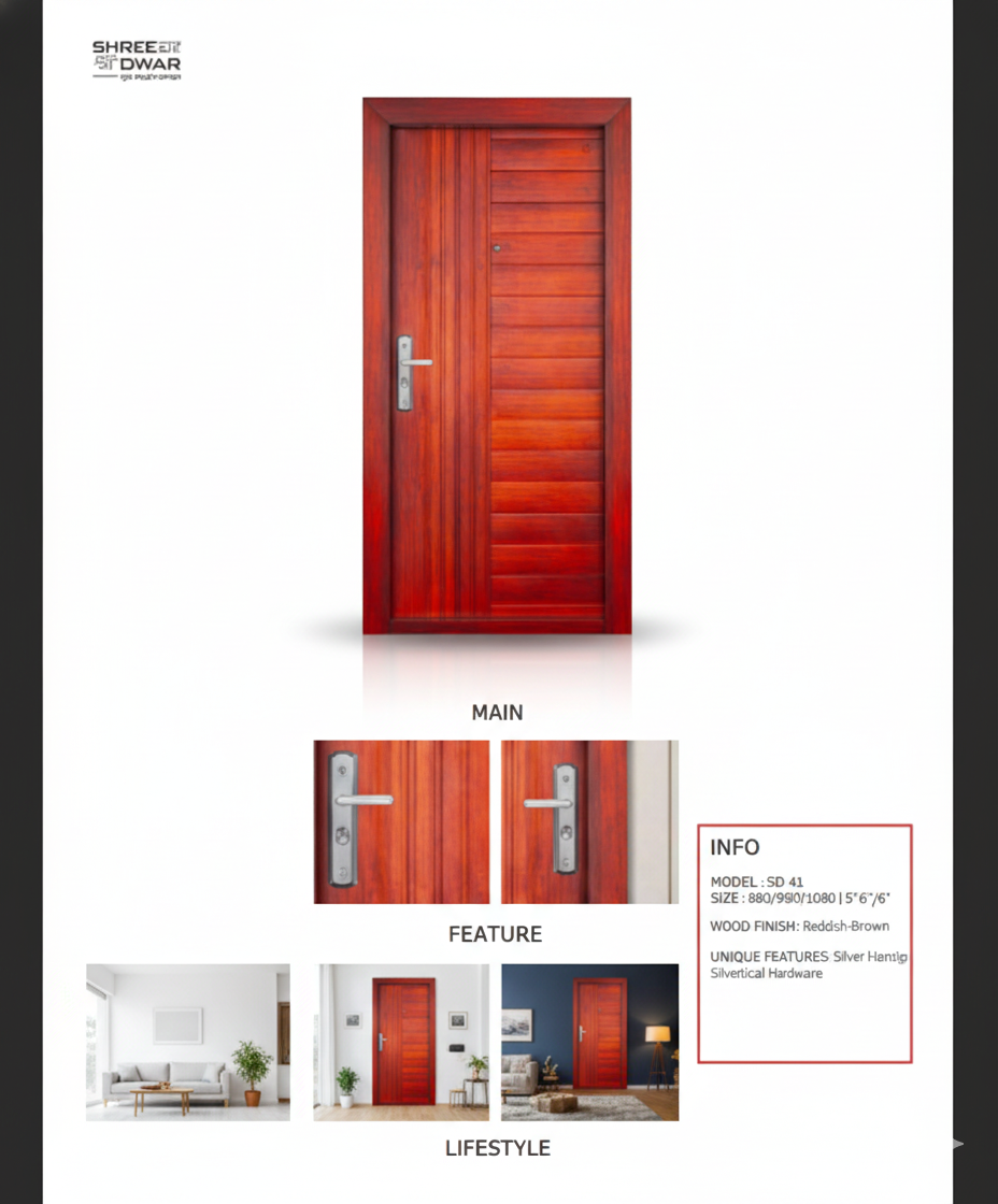 Product 12 (MODEL :SD 41 SIZE :880/980/1080 5″/6″/6″) is engineered using high-grade GI steel and advanced powder coating technology. Each door ensures maximum security, long-lasting durability, and a premium modern appearance.